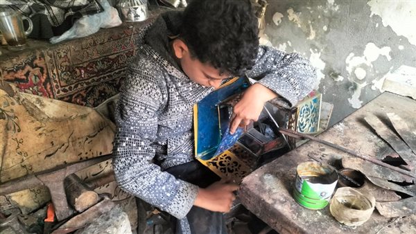 وسط إحدي شوارع مدينة الزقازيق بمحافظة الشرقية، تجد محل صغير الحجم يسوده أتربة الزمن الجميل وتملئ ملامحه فوانيس رمضان المصنوعة من الصاج، ويجلس وسطه «عمار» صاحب الـ 14 عاماً ممسكا في يديه حديده يستخدمها في لحم الفوانيس الصاج.