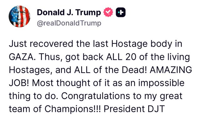وكتب ترامب عبر منصة التواصل الاجتماعي "تروث سوشيال":" تم استعادة جثة الرهينة الأخيرة في غزة. وبذلك، تم استعادة جميع الرهائن العشرين الأحياء، وجميع القتلى! عملٌ رائع!".