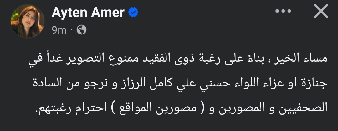 وفي ظل هذه الأجواء الحزينة، أعلنت الفنانة آيتن عامر موقف الأسرة بشكل واضح، مؤكدة رغبتهم في الحفاظ على خصوصية مراسم التشييع والعزاء، وطلبت رسميًا عدم تصوير الجنازة أو العزاء، احترامًا لمشاعر أسرة الفقيد. ووجهت آيتن رسالة مباشرة للصحفيين والمصورين ومراسلي المواقع الإلكترونية، شددت فيها على ضرورة احترام رغبة أهل المتوفى وعدم التواجد بغرضآيتن عامر تطالب باحترام الخصوصية ومنع تصوير جنازة زوج شقيقتها التصوير، مراعاة للظرف الإنساني الصعب الذي تمر به العائلة.