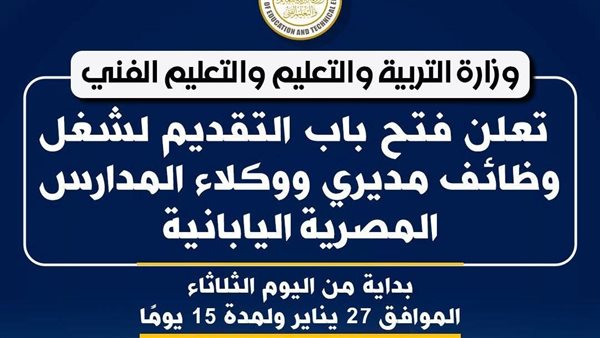 تعلن وزارة التربية والتعليم والتعليم الفني فتح باب التقديم لشغل وظائف مديرين ووكلاء بالمدارس المصرية اليابانية، وذلك تزامنًا مع التوسع في أعداد المدارس ودخول مدارس جديدة الخدمة خلال العام الدراسي المقبل.