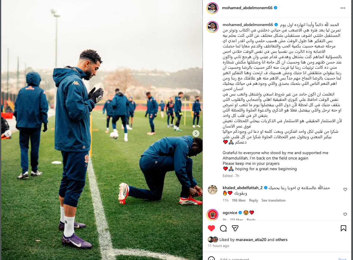 بمشاركته في المران ، يضع محمد عبد المنعم اللمسات الأخيرة على برنامجه التأهيلي قبل العودة للمشاركة في المباريات الرسمية مع نادي نيس الفرنسي والمنتخب الوطني. واختتم اللاعب رسالته بتوجيه الشكر لكل من سانده، واعداً إياهم بالعمل الجاد ليكون عند حسن ظنهم دائماً.