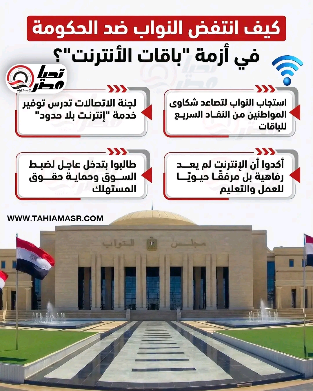 وشدد النواب على أن الإنترنت لم يعد رفاهية يمكن الاستغناء عنها، بل أصبح مرفقًا حيويًا لا غنى عنه في العمل والتعليم والخدمات الرقمية، خاصة مع توسع الدولة في التحول الرقمي، واعتماد المواطنين على المنصات الإلكترونية في إنجاز معاملاتهم اليومية. واعتبروا أن أي خلل في هذا المرفق ينعكس مباشرة على فرص العمل، ومستوى التحصيل الدراسي، وكفاءة الخدمات المقدمة للمواطنين.