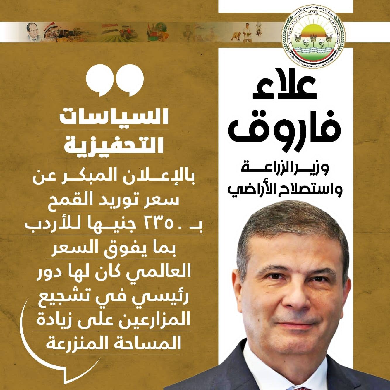 وزير الزراعة: زيادة المساحات المنزرعة بالقمح 600 ألف فدان ورفع سعر الأردب إلى 2350 جنيها