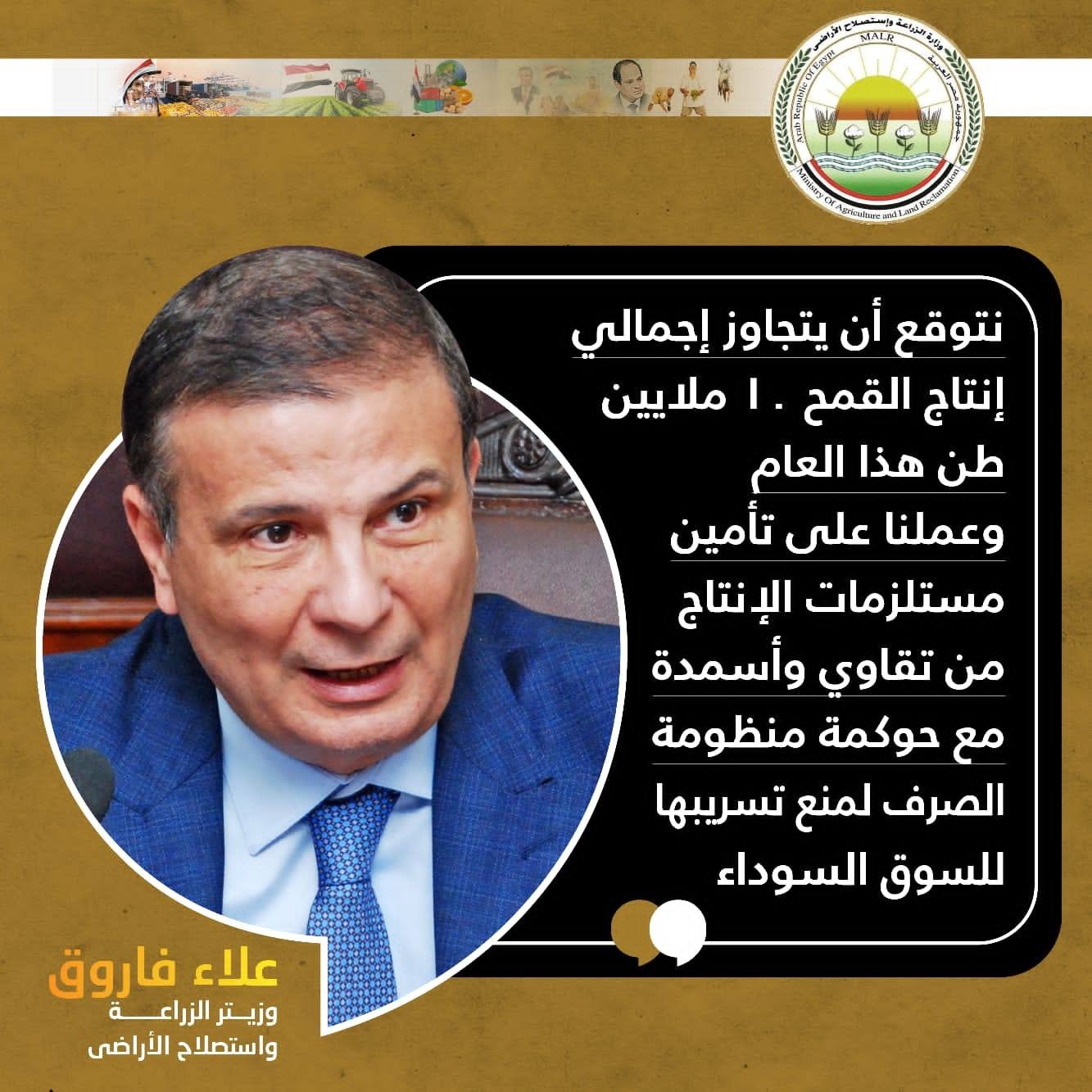 وأوضح وزير الزراعة أنه تم اعتماد سعر تحفيزي للمزارعين بقيمة 2350 جنيها للأردب، بما يسهم في تشجيع التوسع في زراعة القمح ودعم الفلاح المصري، مشيرًا إلى أن التقديرات الأولية تشير إلى تجاوز الإنتاج حاجز 10 ملايين طن خلال الموسم الحالي.