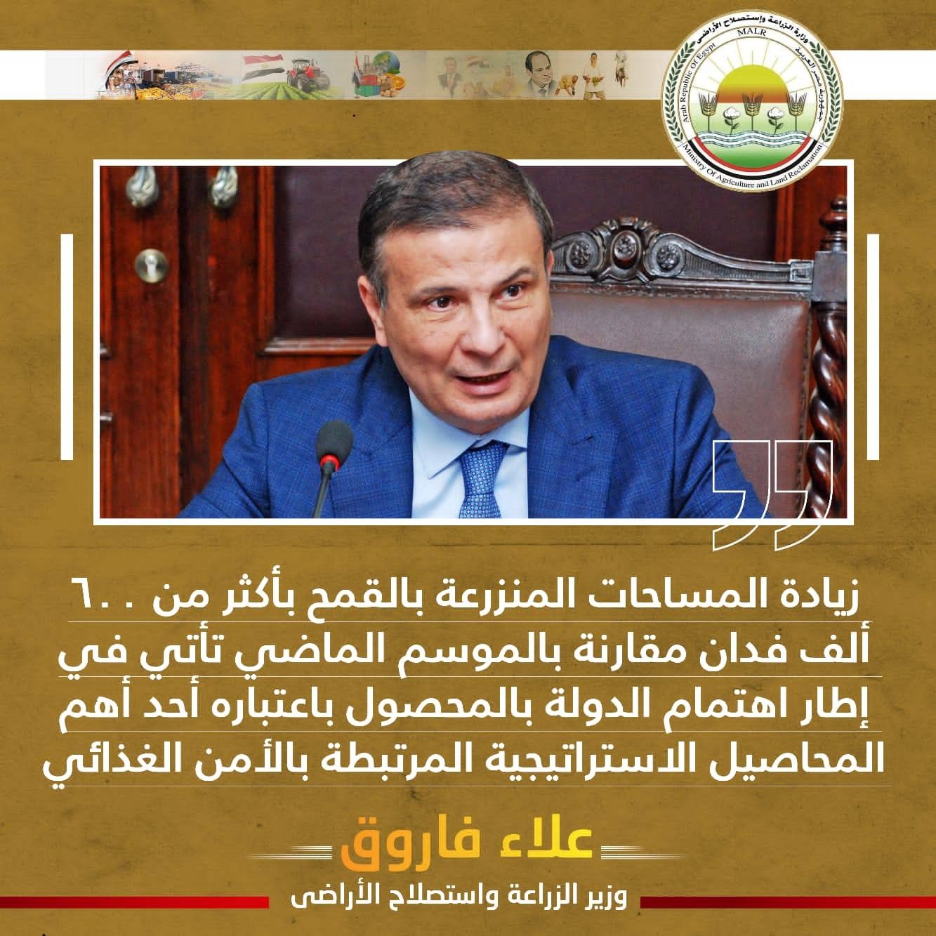 أعلن علاء فاروق، وزير الزراعة واستصلاح الأراضي، عن زيادة المساحات المنزرعة بمحصول القمح بنحو 600 ألف فدان مقارنة بالعام الماضي، لتصل إلى 3.7 مليون فدان على مستوى الجمهورية، في خطوة تعكس جهود الدولة لتعزيز الأمن الغذائي القومي.