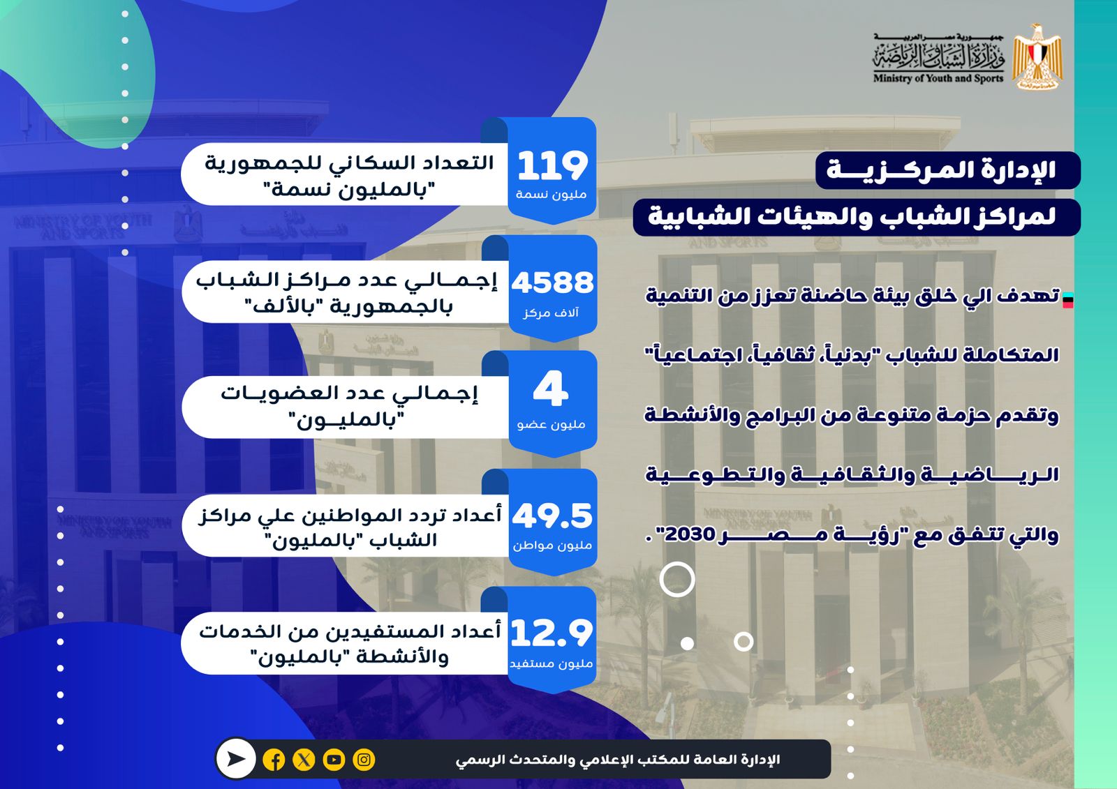 مراكز الشباب تخدم 12.9 مليون مواطن وتستقبل 49.5 مليون زيارة