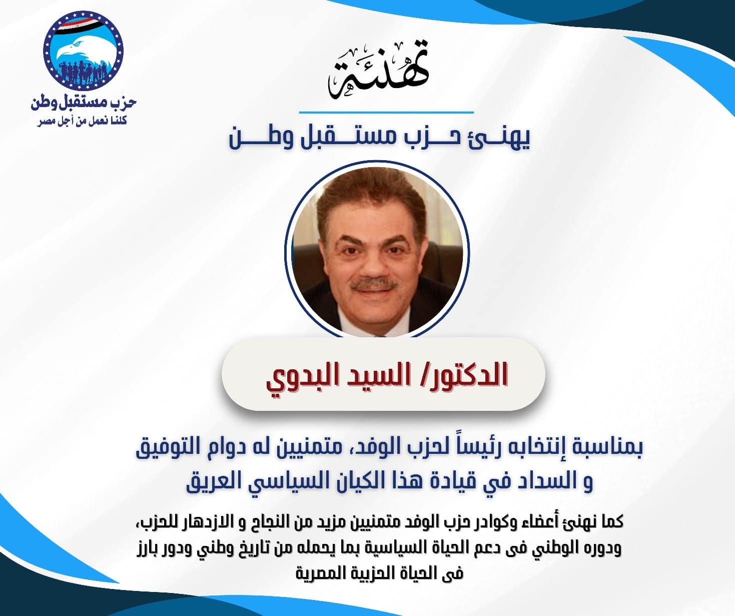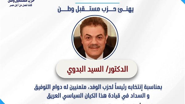 تقدّم حزب مستقبل وطن بخالص التهنئة للدكتور السيد البدوي، بمناسبة انتخابه رئيسًا لحزب الوفد، متمنيًا له دوام التوفيق والسداد في قيادة هذا الكيان السياسي العريق.