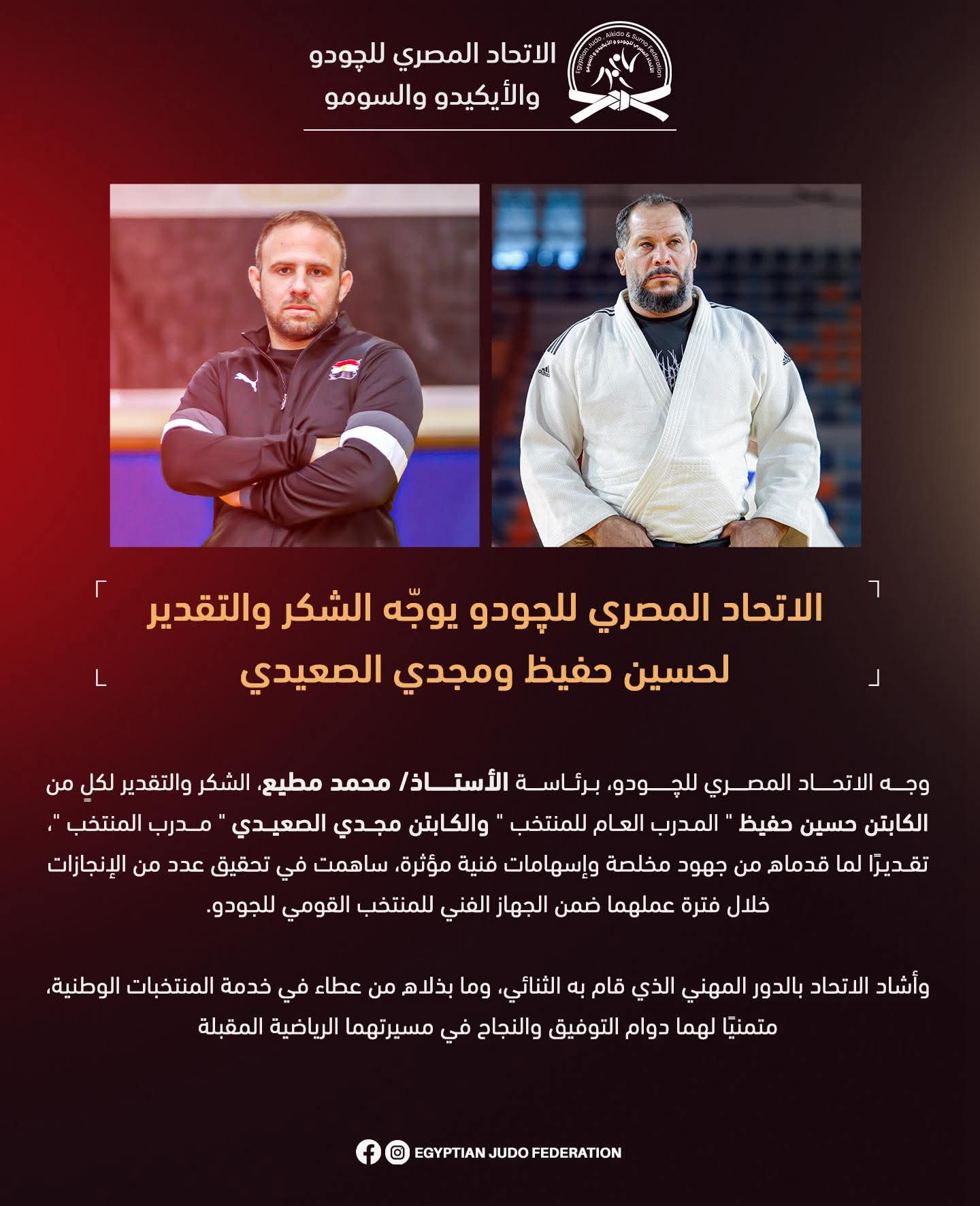 الاتحاد المصري للجودو يعلن تشكيل الجهاز الفني ويوجه الشكر لحفيظ والصعيدي