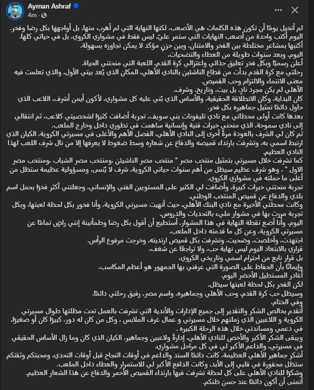 تحيا مصر، وكتب أيمن أشرف عبر حسابه الرسمي"فيس بوك": لم أتخيل يومًا أن تكون هذه الكلمات هي الأصعب، لكنها النهاية التي لم أهرب منها، بل أواجهها بكل رضا وفخر، اليوم أكتب واحدة من أصعب النهايات التي ستمر عليّ، ليس فقط في مشواري الكروي، بل في حياتي كلها، أكتبها بمشاعر مختلطة بين الفخر والامتنان، وبين حزنٍ مؤكد لا يمكن تجاوزه بسهولة.