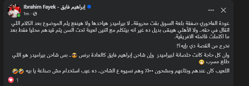 فجر الإعلامي إبراهيم فايق، عبر صفحته الرسمية على "فيسبوك" تفاصيل مثيرة تتعلق بملف عودة الفاخوري إلى الدوري المصري، واصفاً المشهد بعبارات "سوقية" تعكس تعقيد الموقف الراهن للاعب