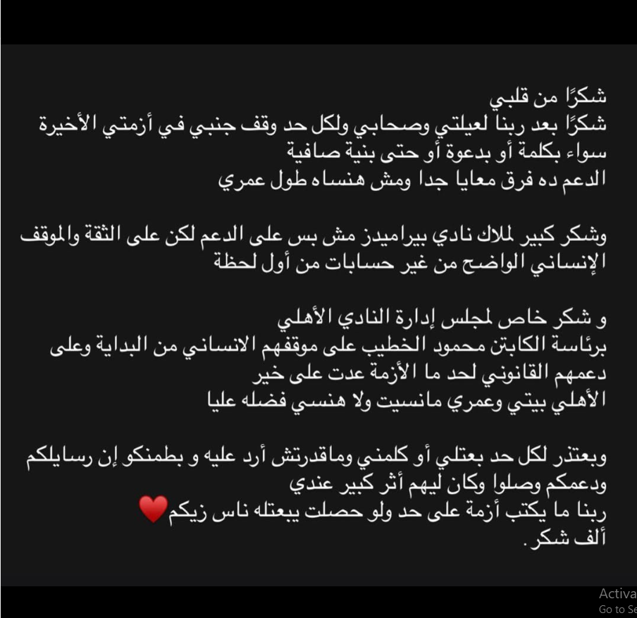 وتابع قائلاً:" شكر خاص لمجلس إدارة النادي الأهلي برئاسة الكابتن محمود الخطيب على موقفهم الانساني من البداية، وعلى دعمهم القانوني لحد ما الأزمة عدت على خير، الأهلي بيتي وعمري مانسيت ولا هنسي فضله عليا".