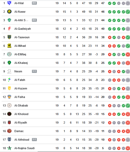 ويستمر الهلال في صدارة دوري روشن السعودي برصيد 47 نقطة، وبفارق نقطة واحدة عن النصر صاحب المركز الثاني برصيد 46 نقطة، كما يتواجد الأهلي في المركز الثالث برصيد 44 نقطة.