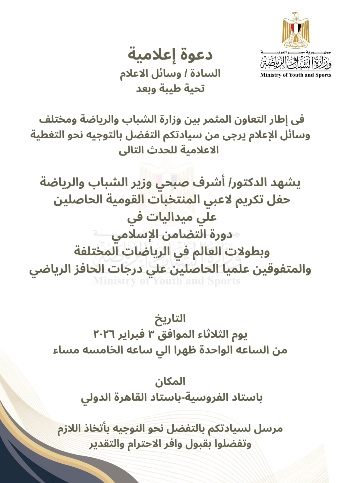 دعت الوزارة وسائل الإعلام المختلفة لتغطية فعاليات الحفل، بهدف إبراز ما حققه أبطال مصر من إنجازات رياضية مشرفة، وتسليط الضوء على جهود الدولة في دعم الشباب والرياضة على مستوى كافة الألعاب الرياضية.