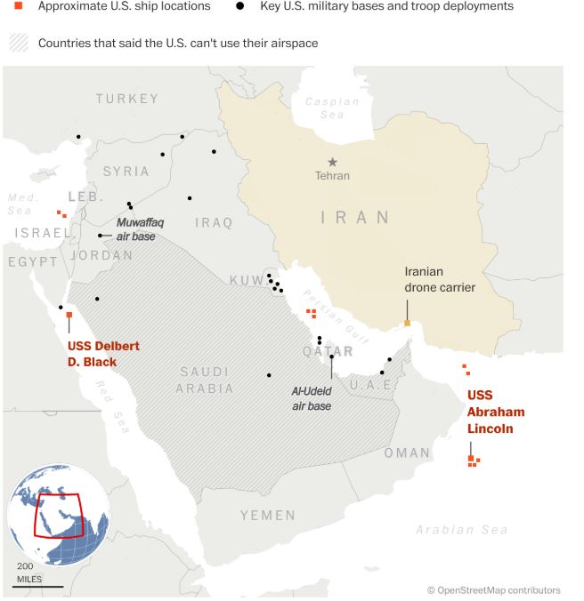 نشر الجيش الأمريكي عشرات الطائرات في قواعد تعمل بالقرب من إيران، وحشد حوالي 12 سفينة حربية في منطقة الشرق الأوسط أو بالقرب منها خلال الشهر الماضي، وفقاً لمسؤولي دفاع أمريكيين وصور الأقمار الصناعية وبيانات التتبع المتاحة، مما يمهد الطريق لضربات أمريكية محتملة ضد النظام الإيراني في الأسابيع المقبلة، دون تأكيد وقوعها.