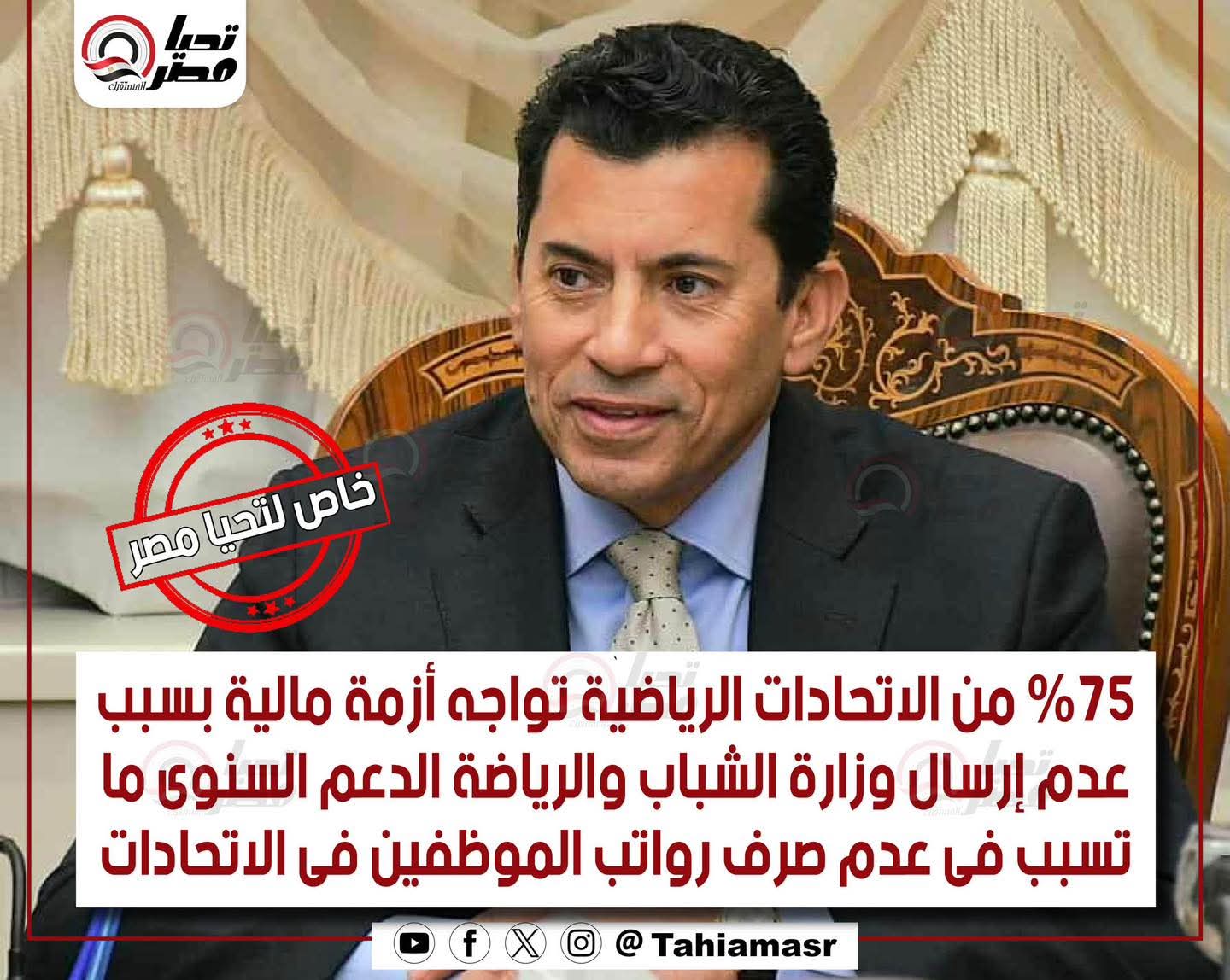 علم موقع «تحيا مصر» من مصادر خاصة، أن أزمة الاتحادات الرياضية وصلت إلى مراحل خطيرة، بعد تأخر الدعم السنوي المخصص من وزارة الشباب والرياضة، حيث تعاني نحو 75٪ من الاتحادات الرياضية من أزمة مالية خانقة أثرت بشكل مباشر على سير العمل الإداري والفني داخل المنظومة الرياضية المصرية، ويستعرض تحيا مصر التفاصيل.
