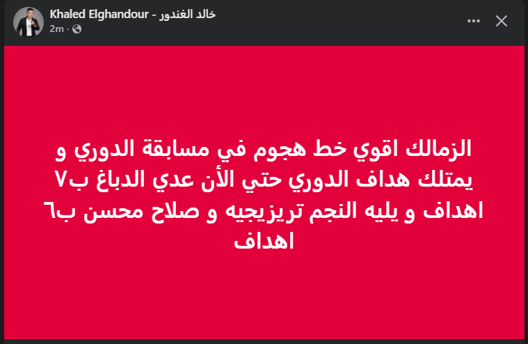 تحيا مصر، كتب خالد الغندور عبر حسابه الرسمي على موقع التواصل الاجتماعي "فيس بوك"، أن الزمالك يتصدر المشهد الهجومي في الدوري، بعدما نجح لاعبوه في تسجيل أكبر عدد من الأهداف مقارنة بباقي الفرق، وهو ما يعكس العمل الكبير الذي يقوم به الجهاز الفني والانسجام الواضح بين عناصر الخط الأمامي.