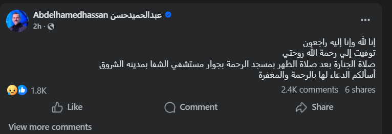 أعلن عبد الحميد حسن نجم النادي الأهلي السابق، وفاة زوجة، صباح اليوم الخميس، بعد تعرضها لوعكه صحية.