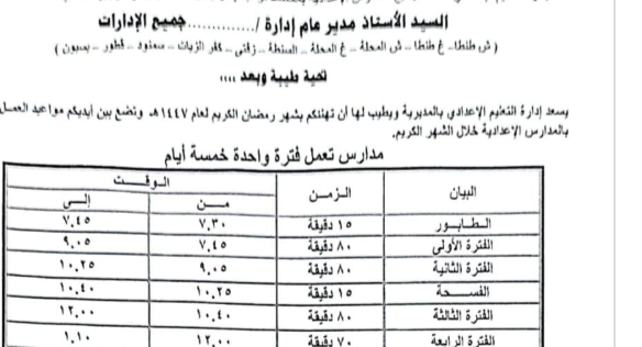 وشددت المديريات التعليمية على ضرورة التزام جميع المدارس الحكومية والخاصة والرسمية للغات بالمواعيد الجديدة خلال شهر رمضان، مع المتابعة اليومية لضمان التنفيذ، واتخاذ الإجراءات القانونية تجاه أي مخالفة.