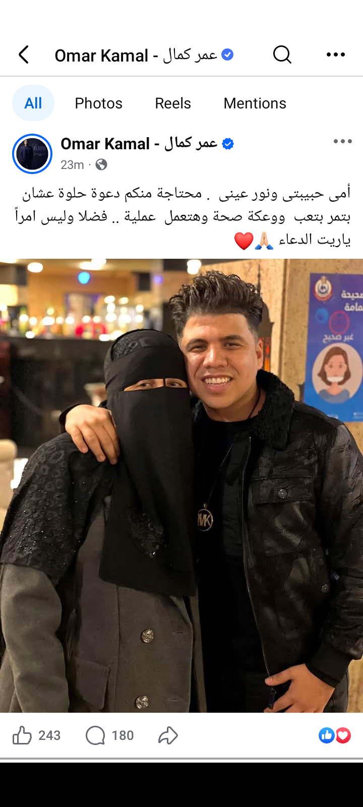 وكتب عمر كمال في منشوره الذي رصده موقع تحيا مصر منذ قليل: "أمى حبيبتى ونور عينى . محتاجة منكم دعوة حلوة عشان بتمر بتعب ووعكة صحة وهتعمل عملية .. فضلا وليس امراً ياريت الدعاء"، مرفقا صورة له رفقة والدته، ليتفاعل الجمهور معه بشكل كبير بالدعاء لوالدته بالشفاء العاجل.
