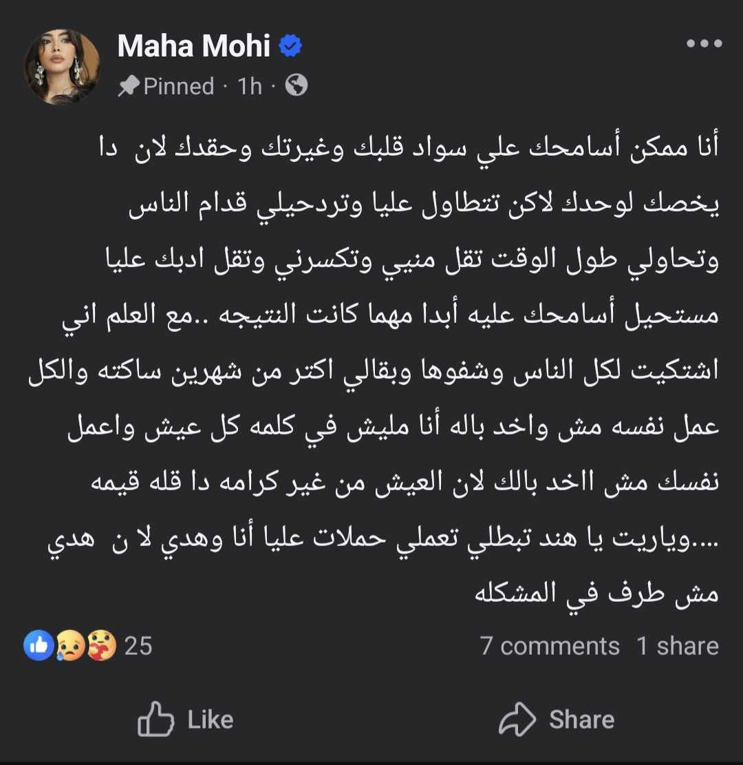 وقالت مها في رسالتها: أنا ممكن أسامحك على سواد قلبك وغيرتك وحقدك لأن دا يخصك لوحدك، لكن التطاول عليا والردح قدام الناس ومحاولات التقليل مني وكسرى وقلة الأدب، مستحيل أسامح عليه أبدًا مهما كانت النتيجة.