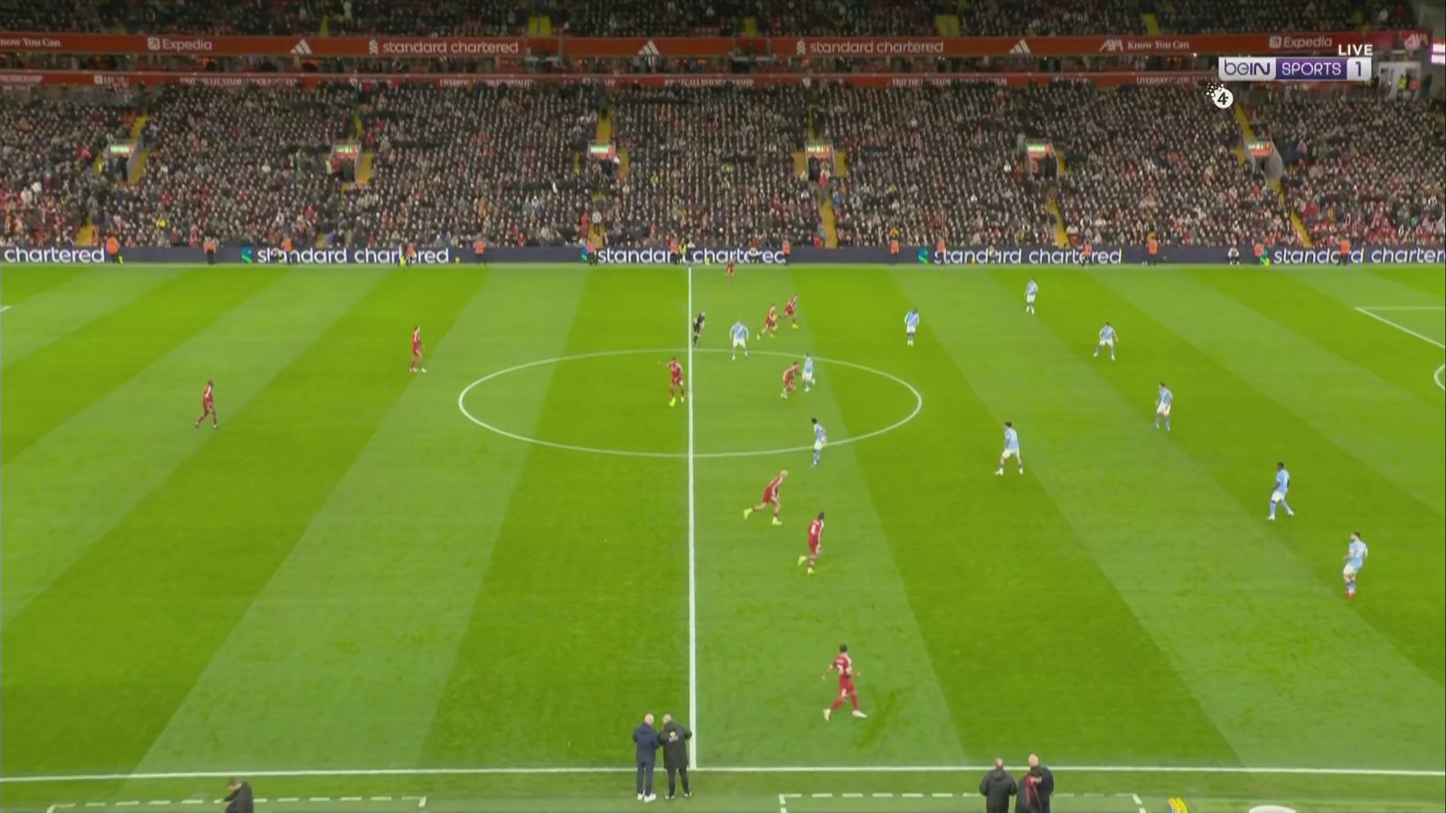 على الجانب الآخر، يحاول مانشستر سيتي فرض سيطرته المعتادة من خلال الاستحواذ والضغط العالي، مع الاعتماد على التحركات السريعة في العمق، إلا أن التنظيم الدفاعي الجيد للفريق الأحمر خلال الشوط الأول فرض على السيتي البحث عن حلول مختلفة مع انطلاق النصف الثاني من اللقاء.