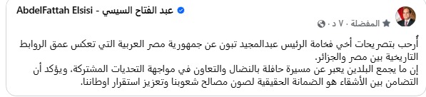 وفي تصريح رسمي، قال الرئيس السيسي عبر صفحته الرسمية على الفيس بوك: "أرحب بتصريحات أخي فخامة الرئيس عبد المجيد تبون عن جمهورية مصر العربية، والتي تعكس عمق الروابط التاريخية بين بلدينا. ما يجمع مصر والجزائر يمثل مسيرة حافلة بالنضال والتعاون في مواجهة التحديات المشتركة، ويؤكد أن التضامن بين الأشقاء هو الضمانة الحقيقية لصون مصالح شعوبنا وتعزيز استقرار أوطاننا."