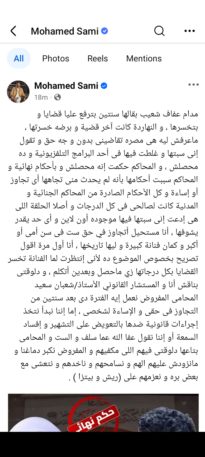 قال محمد سامي في منشور رصده موقع تحيا مصر عن حسابه الرسمي بموقع التواصل الاجتماعي فيسبوك: مدام عفاف شعيب بقالها سنتين بترفع عليا قضايا و بتخسرها ، و النهاردة كانت آخر قضية و برضه خسرتها ، ماعرفش ليه هى مصره تقاضينى بدون و جه حق و تقول إنى سبتها و غلطت فيها فى أحد البرامج التلفزيونية و ده محصلش ، و المحاكم حكمت إنه محصلش و بأحكام نهائية و المحاكم سببت أحكامها بأنه لم يحدث منى تجاهها أى تجاوز أو إساءة و كل الأحكام الصادرة من المحاكم الجنائية و المدنية كانت لصالحى فى كل الدرجات و أصلا الحلقة اللى هى إدعت إنى سبتها فيها موجوده أون لاين و أى حد يقدر يشوفها .