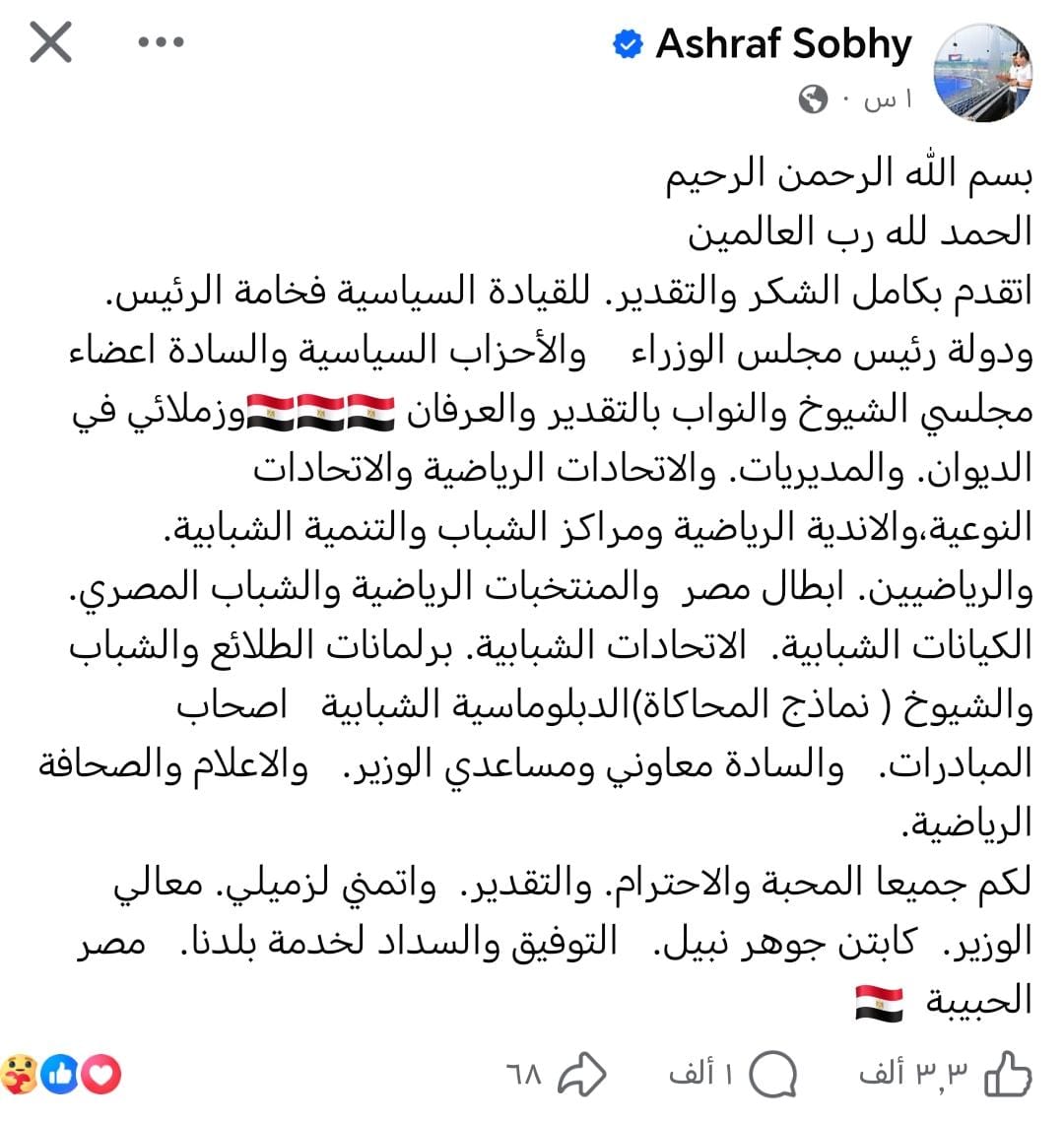 نشر أشرف صبحي عبر حسابه الرسمي على “فيس بوك” قائلاً، بسم الله الرحمن الرحيم، الحمد لله رب العالمين.