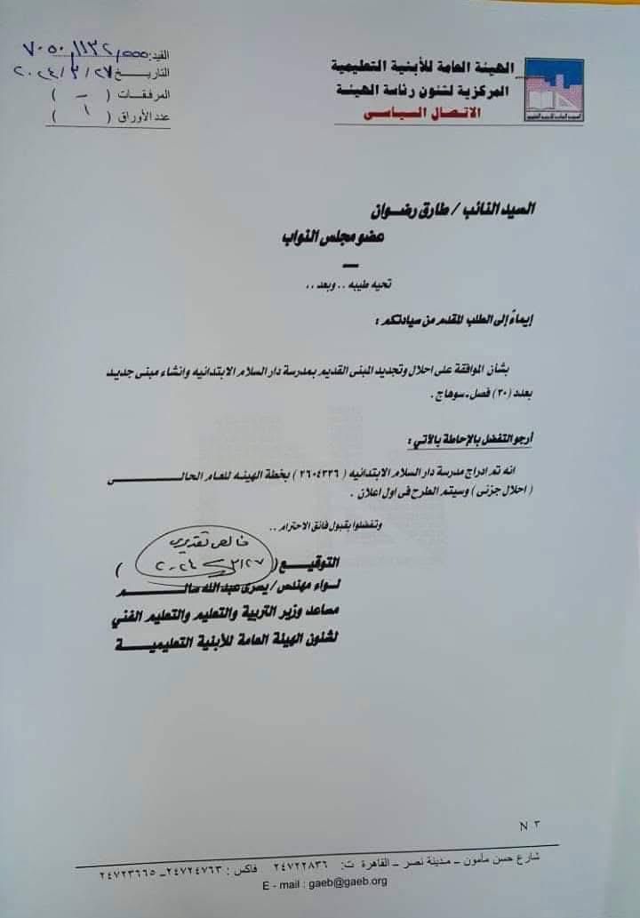 افتتح اللواء محافظ سوهاج، يرافقه النائب طارق رضوان رئيس لجنة حقوق الإنسان بمجلس النواب، والنائب عبداللطيف جمال، مدرستي دار السلام الابتدائية المشتركة ودار السلام الإعدادية، وذلك عقب الانتهاء من أعمال التطوير والتوسعة، بتكلفة إجمالية بلغت 41 مليونًا و910 آلاف جنيه.