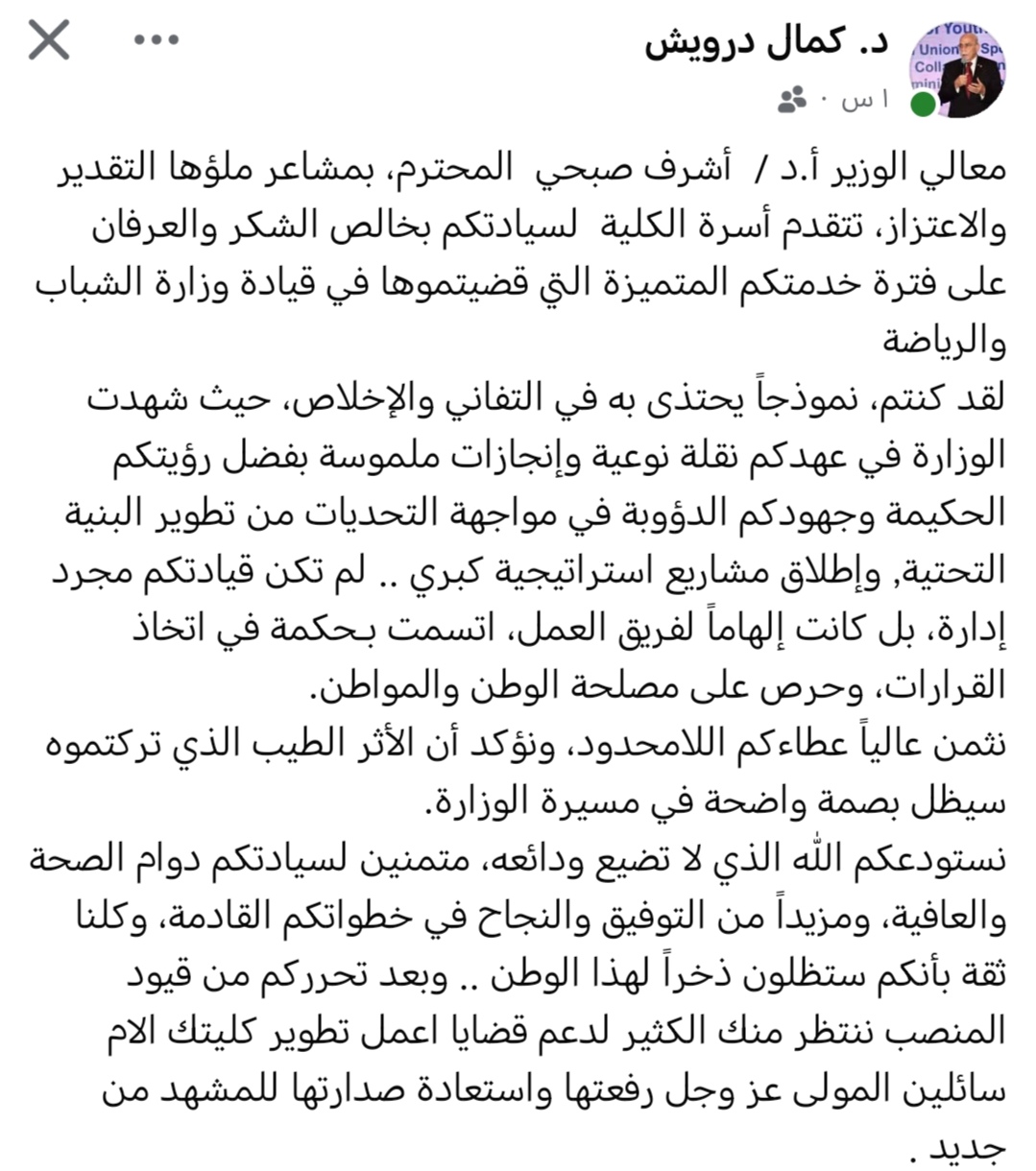 واختتم كمال درويش رسالته بتوجيه الشكر والتقدير للدكتور أشرف صبحي، متمنيًا له دوام الصحة والتوفيق في خطواته المقبلة، مؤكدًا أن عطائه لم ولن يتوقف، وأنه سيظل داعما أساسيا لقضايا تطوير التعليم والرياضة وخدمة الوطن.