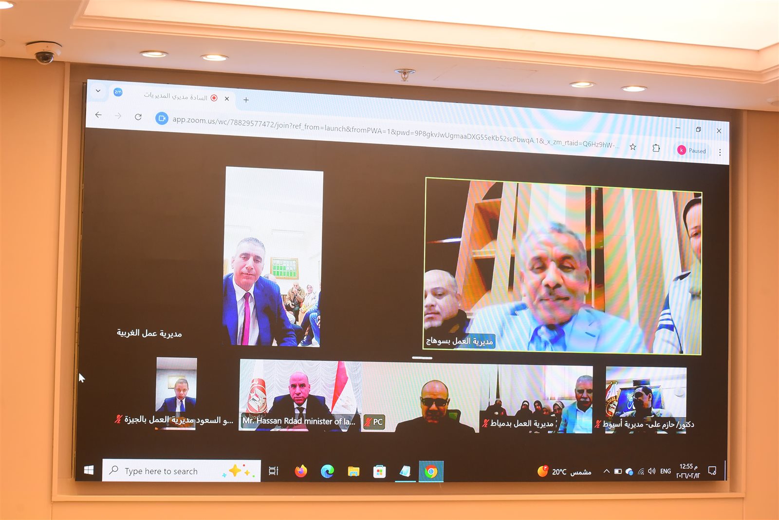 عقد وزير العمل حسن رداد لقاءً موسعًا مع مديري مديريات العمل والعاملين بها عبر تقنية الفيديو كونفرانس، في إطار حرصه على التواصل المباشر مع صفوف العمل الأولى، مؤكدًا الالتزام بتنفيذ توجيهات فخامة الرئيس عبد الفتاح السيسي والحكومة فيما يخص ملفات العمل، وعلى رأسها التنمية البشرية وتأهيل الكوادر لسوق العمل المحلي والعربي والدولي، باعتبار الإنسان محور التنمية وغايتها.