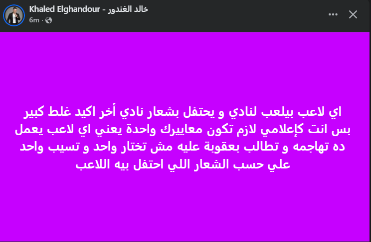 وكتب خالد الغندور عبر حسابه الرسمي"فيس بوك": أي لاعب بيلعب لنادي، و يحتفل بشعار نادي أخر اكيد غلط كبير بس أنت كإعلامي لازم تكون معاييرك، واحدة يعني أي لاعب يعمل ده تهاجمه، و تطالب بعقوبة عليه مش تختارواحد، و تسيب واحد علي حسب الشعار اللي احتفل بيه اللاعب".