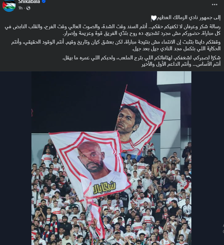 واختتم شيكابالا رسالته قائلًا:“شكرًا لصبركم، لشغفكم، لهتافاتكم اللي بترج الملعب، ولحبكم اللي عمره ما بيقل. أنتم الأساس، وأنتم الداعم الأول والأخير.”