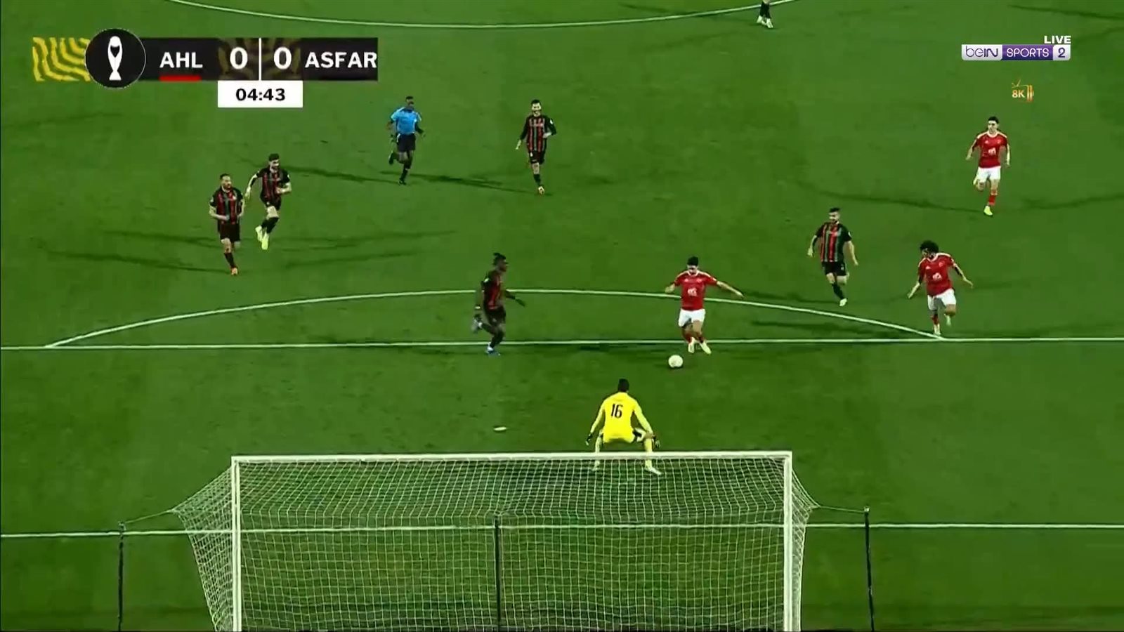 رد الأهلي لم يتأخر كثيرًا، ففي الدقيقة الرابعة انفرد محمد علي بن رمضان بمرمى الفريق المغربي بعد تمريرة بينية متقنة، إلا أنه لم ينجح في ترجمة الفرصة إلى هدف، بعدما سدد الكرة خارج الإطار في فرصة كانت كفيلة بتغيير مجرى المباراة مبكرًا. وواصل الأهلي ضغطه، وسدد أليو ديانج كرة قوية في الدقيقة السابعة، لكنها جاءت في متناول حارس الجيش الملكي الذي تعامل معها بثبات.