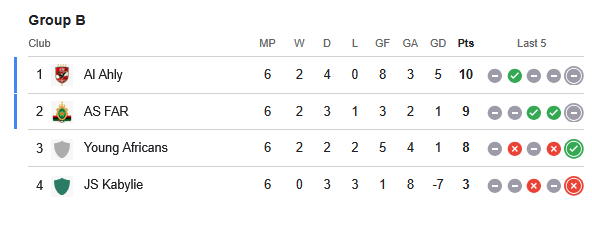 يستمر البحث عن caf champions league.. ترتيب مجموعات دوري ابطال افريقيا بعد نهاية الجولة السادسة، وانتهت مباريات الجولة السادسة بتعادل سلبي بين الأهلي والجيش الملكي المغربي بجانب فوز يانج أفريكانز التنزاني على شبيبة القبائل الجزائري، ويستعرض موقع تحيا مصر التفاصيل.