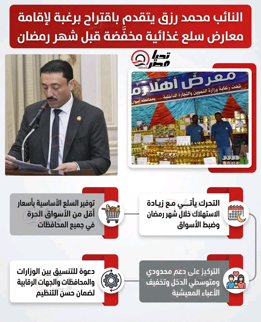في خطوة تستهدف دعم المواطنين، تقدّم النائب الدكتور محمد رزق، عضو مجلس الشيوخ باقتراح برغبة موجّه إلى كلٍّ من الدكتور شريف فاروق وزير التموين والدكتورة منال عوض وزيرة التنمية المحلية، لإقامة معارض للسلع الغذائية الأساسية بأسعار مخفّضة في مختلف محافظات مصر، قبل حلول شهر رمضان المبارك.