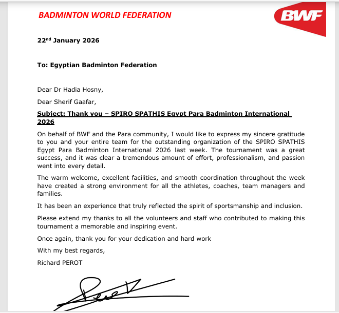 وأرسل الاتحاد الدولي للريشة الطائرة خطاب شكر رسمي إلى الاتحاد المصري للريشة الطائرة، أعرب خلاله عن تقديره الكبير لمستوى التنظيم والاحترافية العالية التي ظهرت بها البطولات، مؤكدًا أن تنظيم مصر لبطولات الريشة الطائرة بات نموذجا يحتذى به على المستوى الدولي.