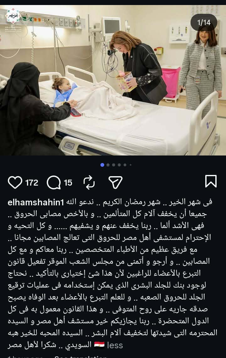 وتحدثت الهام شاهين بشكل خاص عن حاجتنا لوجود بنك للجلد البشري لاستخدامه في عمليات الترقيع لضحايا الحروق الصعبة مؤكدة أن هذا القرار يظل اختياريا تماما للراغبين في العطاء، وذلك ضمن منشور رصده موقع تحيا مصر على حسابها الرسمي بموقع تبادل الصور والفيديوهات انستجرام.