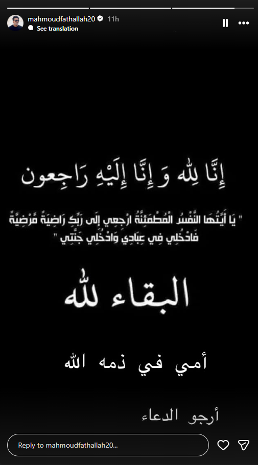 تحيا مصر، وجاء الإعلان عبر الصفحة الشخصية للاعب على موقع “إنستجرام”، حيث نشر رسالة مقتضبة كشف فيها عن رحيل والدته، طالبًا الدعاء لها بالرحمة والمغفرة.