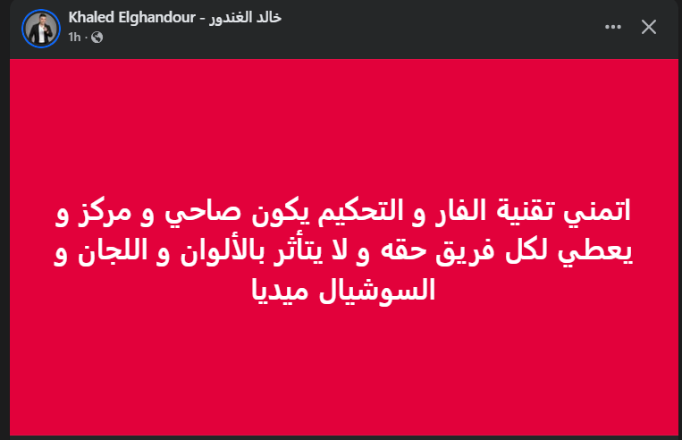 تحيا مصر، وكتب خالد الغندور عبر حسابه الرسمي على "فيس بوك": "أتمنى تقنية الفار والتحكيم يكون صاحي ومركز ويعطي لكل فريق حقه.. ولا يتأثر بالألوان واللجان والسوشيال ميديا".