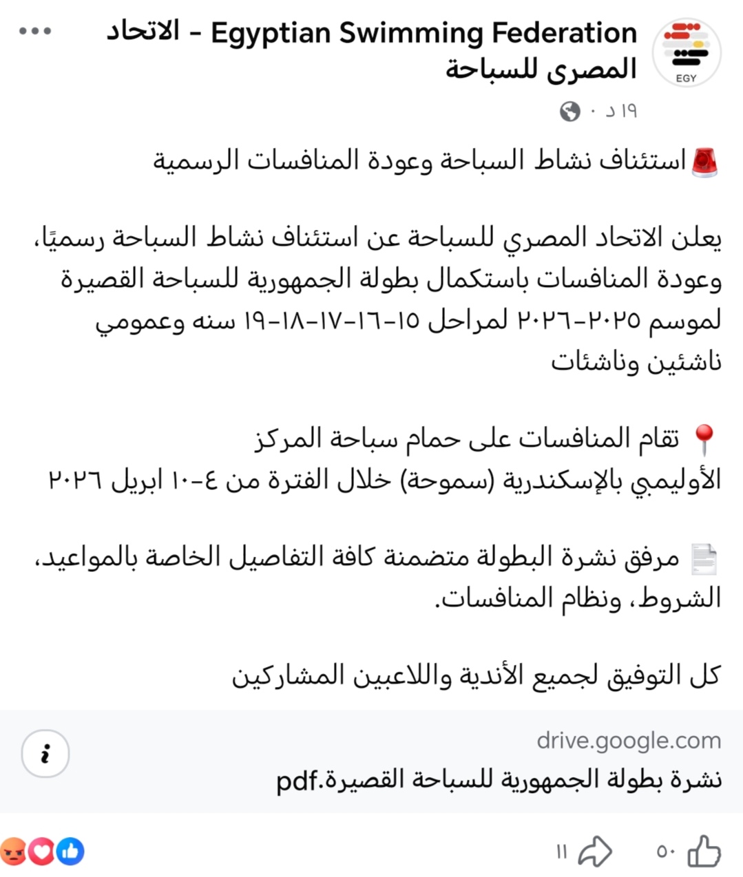 تقرر إقامة منافسات بطولة الجمهورية للسباحة القصيرة خلال الفترة من 4 إلى 10 أبريل 2026، على مجمع حمام سباحة المركز الأوليمبي بالإسكندرية، بمشاركة مراحل 15 و16 و17 و18 و19 سنة وعمومي ناشئين وناشئات.