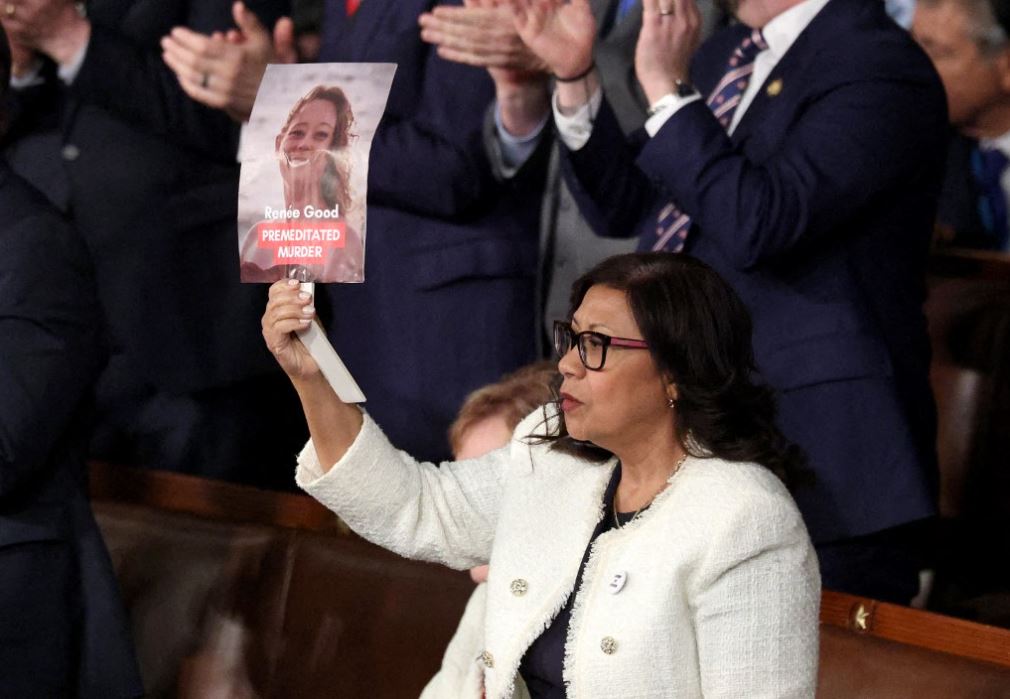 ورفعت النائبة نورما توريس لافتة تحمل صور رينيه نيكول جود وأليكس بريتي، وهما مواطنان أمريكيان قتلا خلال عمليات تنفيذ القانون في مينيابوليس خلال شهر يناير الماضي.