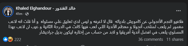وكتب خالد الغندور عبر حسابه الرسمي على “فيس بوك” تعليقًا انتقد فيه الصفقة بشكل مباشر، مشيرًا إلى أن اختيار كامويش يثير العديد من علامات الاستفهام، في ظل عدم امتلاكه سيرة ذاتية قوية تؤهله للعب في نادٍ بحجم الأهلي.