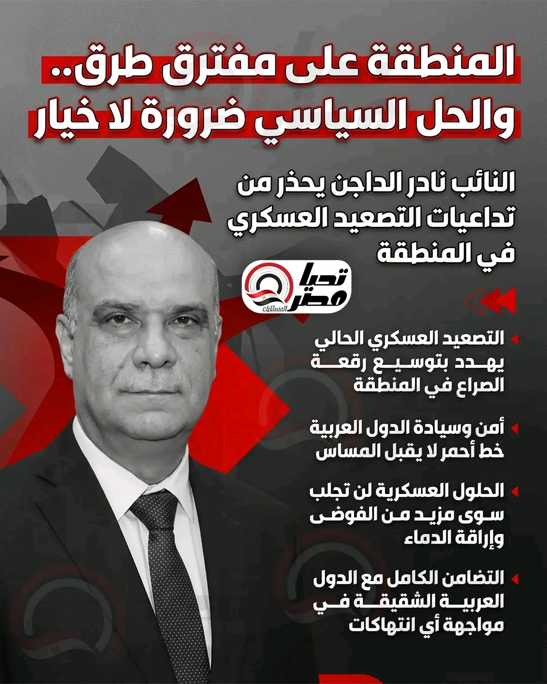 وأشار إلى أن اللجوء إلى الحلول العسكرية لن يفضي إلا إلى مزيد من التصعيد وتعقيد المشهد، مؤكدًا أن المسار الدبلوماسي والحوار السياسي يظلان السبيل الوحيد لاحتواء الأزمة ومنع انزلاق المنطقة إلى صراع أوسع يصعب السيطرة عليه.