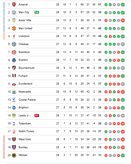 - ترتيب الدوري الإنجليزي الممتاز الحالي