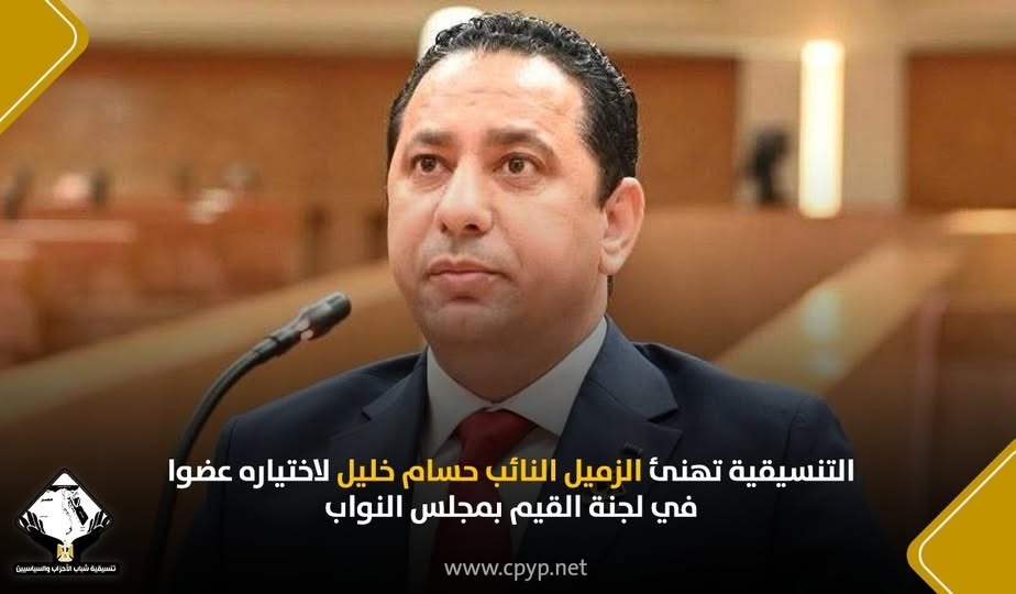 وتتمنى تنسيقية شباب الأحزاب والسياسيين للنائب حسام خليل دوام التوفيق والسداد في ممارسة مهام عمله داخل لجنة القيم، والنجاح المستمر على جميع المستويات البرلمانية، بما يسهم في تطوير أداء المجلس وتعزيز الرقابة والشفافية.