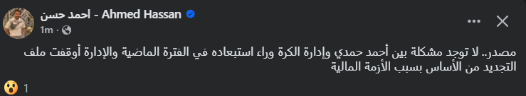 تحيا مصر، وجاءت تصريحات أحمد حسن لتضع حدًا للتكهنات التي انتشرت مؤخرًا بشأن وجود خلافات بين اللاعب والإدارة، خاصة بعد توقف الحديث عن ملف تجديد عقده، وكتب عبر حسابه: "لا توجد مشكلة بين أحمد حمدي نجم الزمالك ومجلس إدارة الزمالك، والإدارة أوقفت ملف التجديد من الأساس بسبب الأزمة المالية".