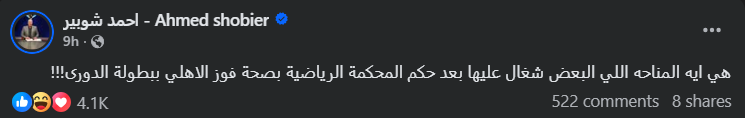 فيما و انتقد الإعلامي أحمد شوبير حالة الجدل المثارة عقب القرار، مستنكرًا اعتراض البعض على الحكم النهائي. وكتب عبر حسابه الرسمي على منصة «إكس»: «هي إيه المناحة اللي البعض شغال عليها بعد حكم المحكمة الرياضية بصحة فوز الأهلي ببطولة الدوري»، في إشارة واضحة إلى رفضه للتشكيك في قرار جهة قضائية رياضية دولية.