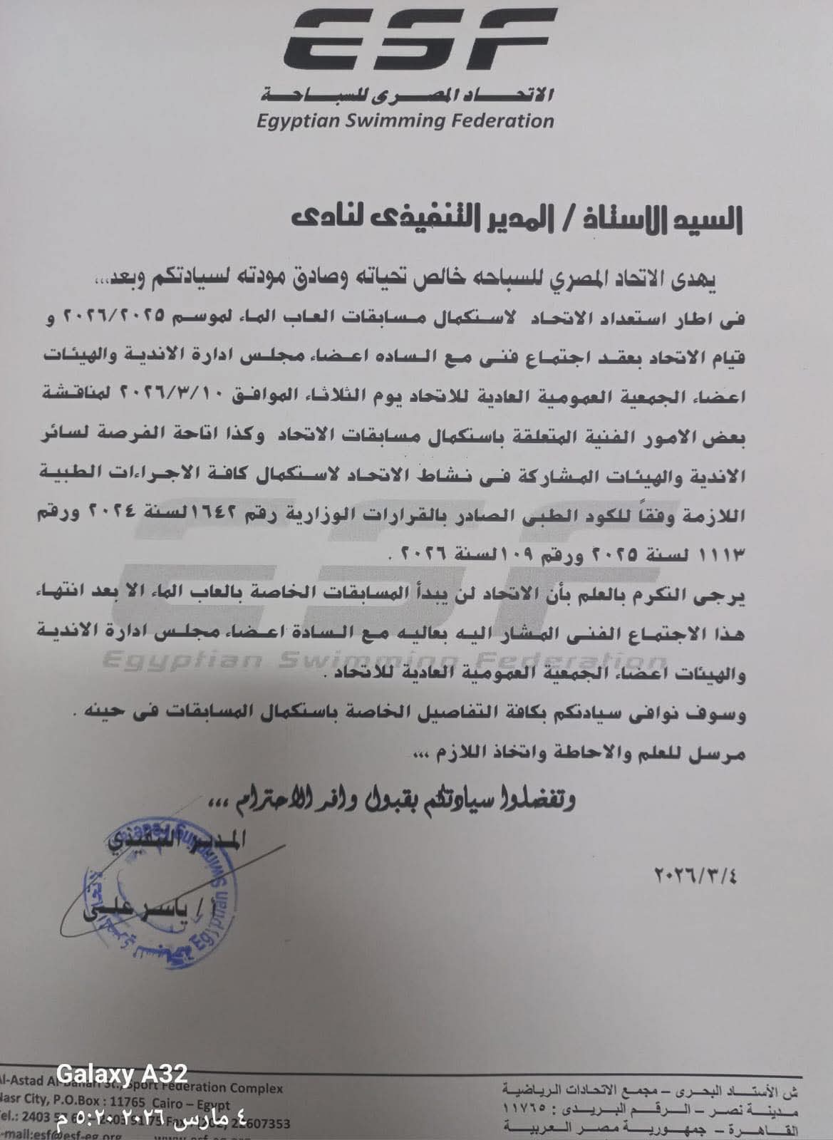 وذلك لمناقشة بعض الامور الفنية المتعلقة باستكمال مسابقات العاب الماء، واتاحة الفرصة لسائر الاندية والهيئات المشاركة في نشاط الاتحاد لاستكمال كافة الاجراءات الطبية اللازمة وفقا للكود الطبي الصادر بالقرارات الوزارية رقم 1642 لسنة 2024 ورقم 1113 لسنة 2025 ورقم 109 لسنة 2026.