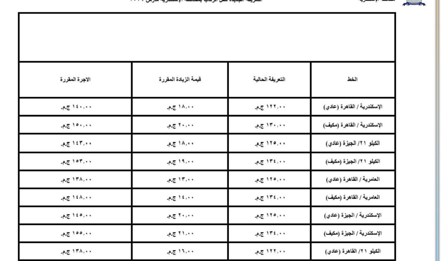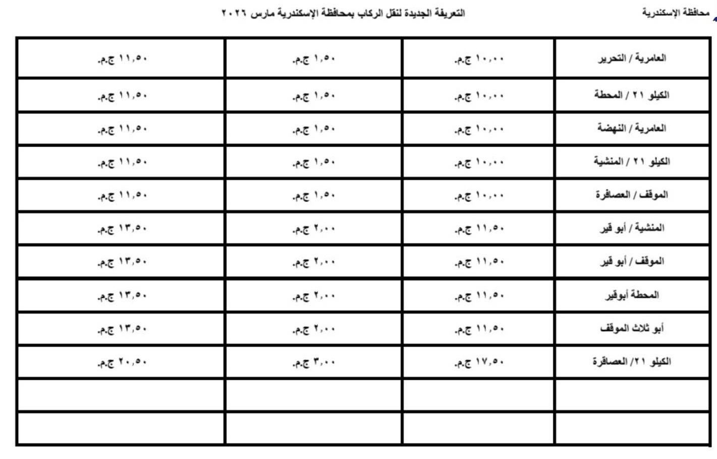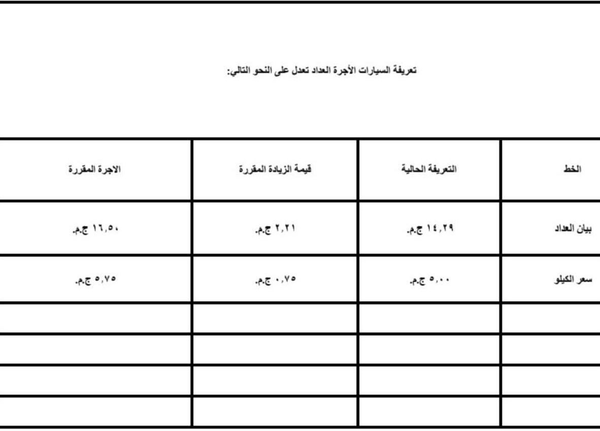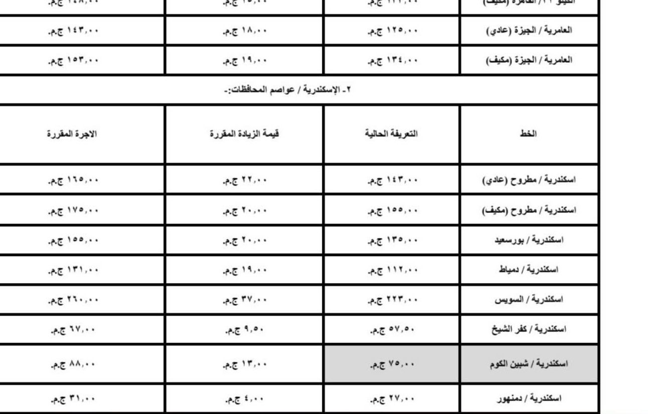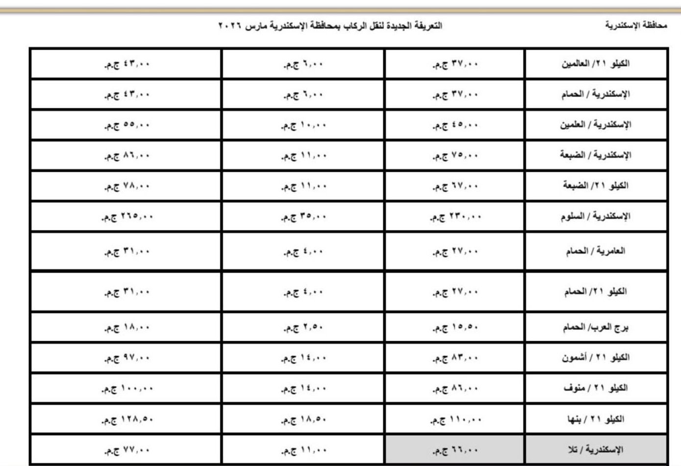اعتمد اليوم محافظ الإسكندرية، تعريفة الركوب الجديدة لسيارات الأجرة لوسائل النقل الداخلية والخارجية والنقل العام بالمحافظة والمقدمة من مشروع مواقف سيارات النقل الجماعى والهيئة العامة لنقل الركاب بمحافظة الاسكندرية ويتم تطبيقها بدء من تاريخ الاعتماد طبقا للجداول المرفقة، وذلك في ضوء قرار لجنة التسعير التلقائي لأسعار المنتجات البترولية بوزارة البترول وتحريك الأسعار لبعض